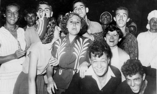 Au premier rang, en Pierrot : Roro SARDA, à sa droite (avec casquette et béret) les 2 frères de Pierrot BRAHIMI. Ce dernier se trouve un peu plus en arrière, entouré de Marie et Marita CHOURAQUI.