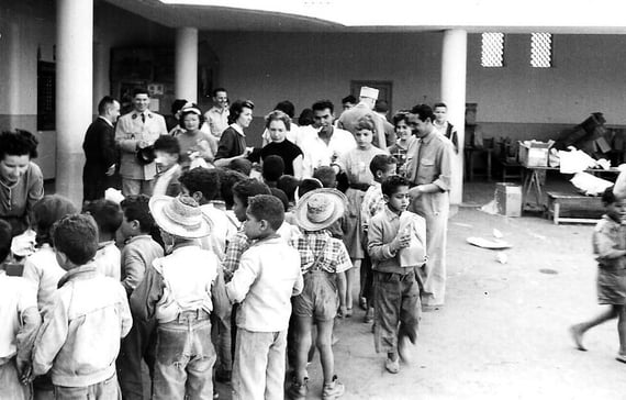 Distribution de cadeaux, à l'occasion de la fête des mères, dans une école de la ville, le 31 mai 1958